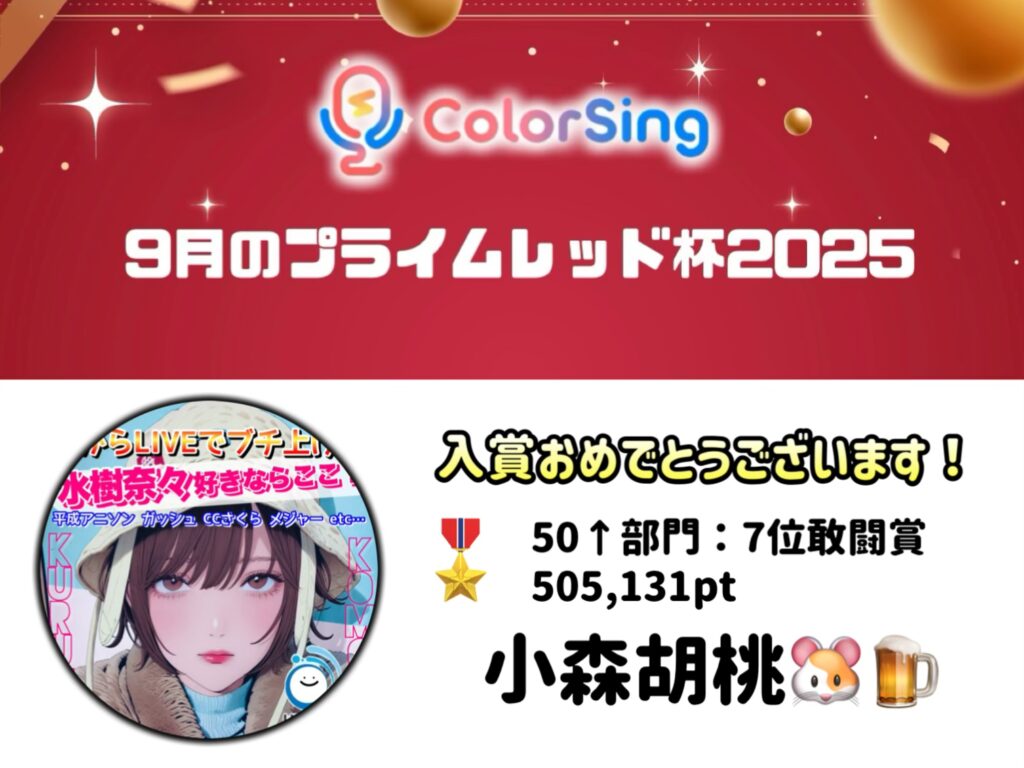 2025年9月23日から28日にColorSingにて開催された『9月のプライムレッド杯2025』に弊社所属ライバーが2名入賞しました!たくさんの応援ありがとうございました!