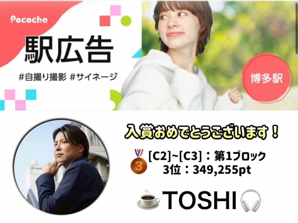 2026年3月25日から31日にPocochaにて開催された『博多駅広告』[C2]~[C3]ステージにおいて、弊社所属の「TOSHI」さんが3位を獲得されました!