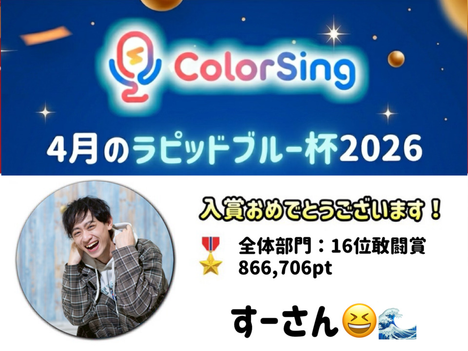 2026年4月12日から13日にColorSingにて開催された『4月のプライムレッド杯2026』に弊社所属ライバーのすーさん さんが入賞しました!たくさんの応援ありがとうございました!